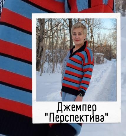 Наш джемпер вместил в себя все «фишки» : воротник-поло, заниженное плечо, однофонтурный жаккард и цветные полосы.